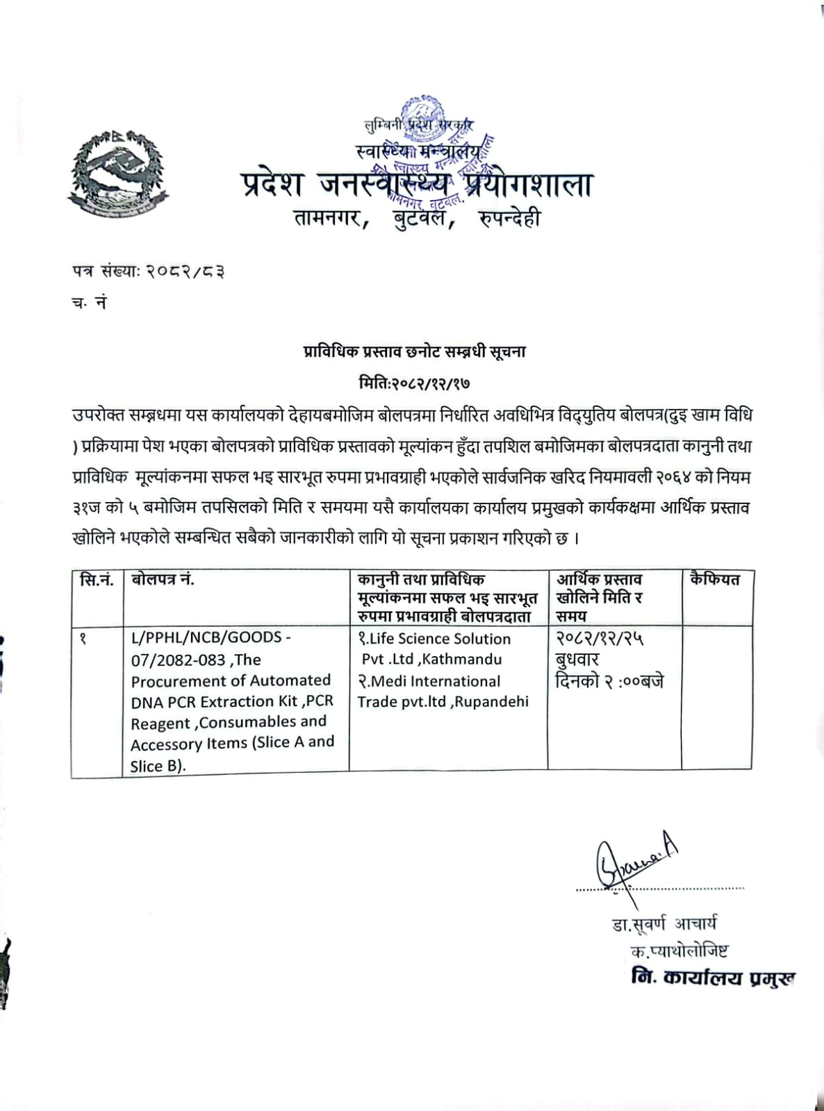 प्राविधिक प्रस्ताव छनौट सम्बन्धि सूचना